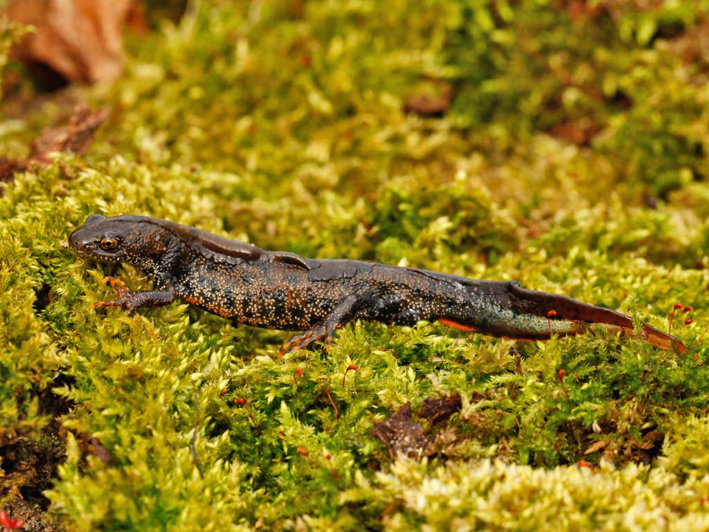 Der Teichmolch ( Triturus vulgaris bzw. heute meist Lissotriton vulgaris ) ist eine der häufigsten Molcharten Europas und ist auch im Berliner Bezirk Marienfelde heimisch. Er besiedelt bevorzugt strukturreiche Landschaften mit kleinen Teichen, Tümpeln, Gräben und feuchten Wiesen. Entscheidend für sein Vorkommen sind ruhige, möglichst fischfreie Gewässer, die ihm geeignete Bedingungen für die Fortpflanzung bieten. Während der Paarungszeit im Frühjahr zeigen die Männchen eine auffällige Wassertracht mit gewelltem Rückenkamm und intensiverer Färbung.