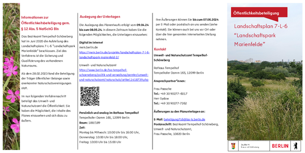 stellt am 19.April 2024 ab 16:00 Uhr auf einer Informationsveranstaltung den Landschaftsplan auf der Naturschutz- und Rangerstation Marienfelde vor.