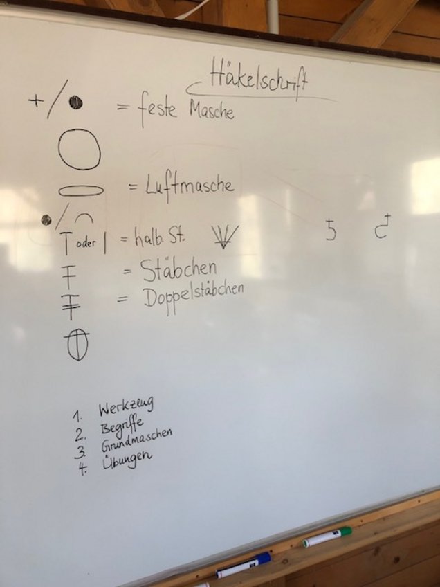 Es begann mit der ersten Anfangsmasche und den einfachen Luftmaschen. Nach einem Strang von ca. 30 cm wechselten wir in die zweite Reihe zurück mit einer festen Masche. Als Letztes häkelten wir die Stäbchen, und schon war die Zeit wieder um. Es war zwar schwierig für den Anfang, aber alle hatten ein erstaunlich tolles Ergebnis.