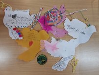 Am 21. September 2024 fand das alljährliche Domagkstraßenfest statt. Auch die Natur- und Rangerstation war dort vertreten, um ihr JuniorRanger Projekt vor zu stellen. Dieses Jahr hatten wir aber noch eine weitere Aufgabe. Und zwar die Wünsche der Kinder zu "pflanzen". Kinder konnten am Stand der Kita Stegerwaldstraße Friedenstauben basteln und diese an unseren Pflaumenbaum hängen. Dieser wurde dann auf dem Gelände der Station eingepflanzt. Klicken Sie sich gerne durch die Bilder der gebastelten Tauben und die dazugehörigen Wünsche.