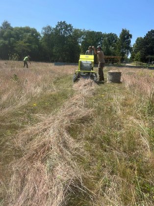Mitte Juni wurde auf einer der neuen Flächen an der Naturschutzstation erstmals gemäht – als Maßnahme der Biotop-, Natur- und Landschaftspflege. Durch die Mahd entstehen wertvolle Offenlandbereiche, die für viele Insekten, Vögel und Pflanzen lebenswichtig sind. Sie verhindert Verbuschung, fördert den Erhalt artenreicher Biotope und die Vielfalt dieser Arten.